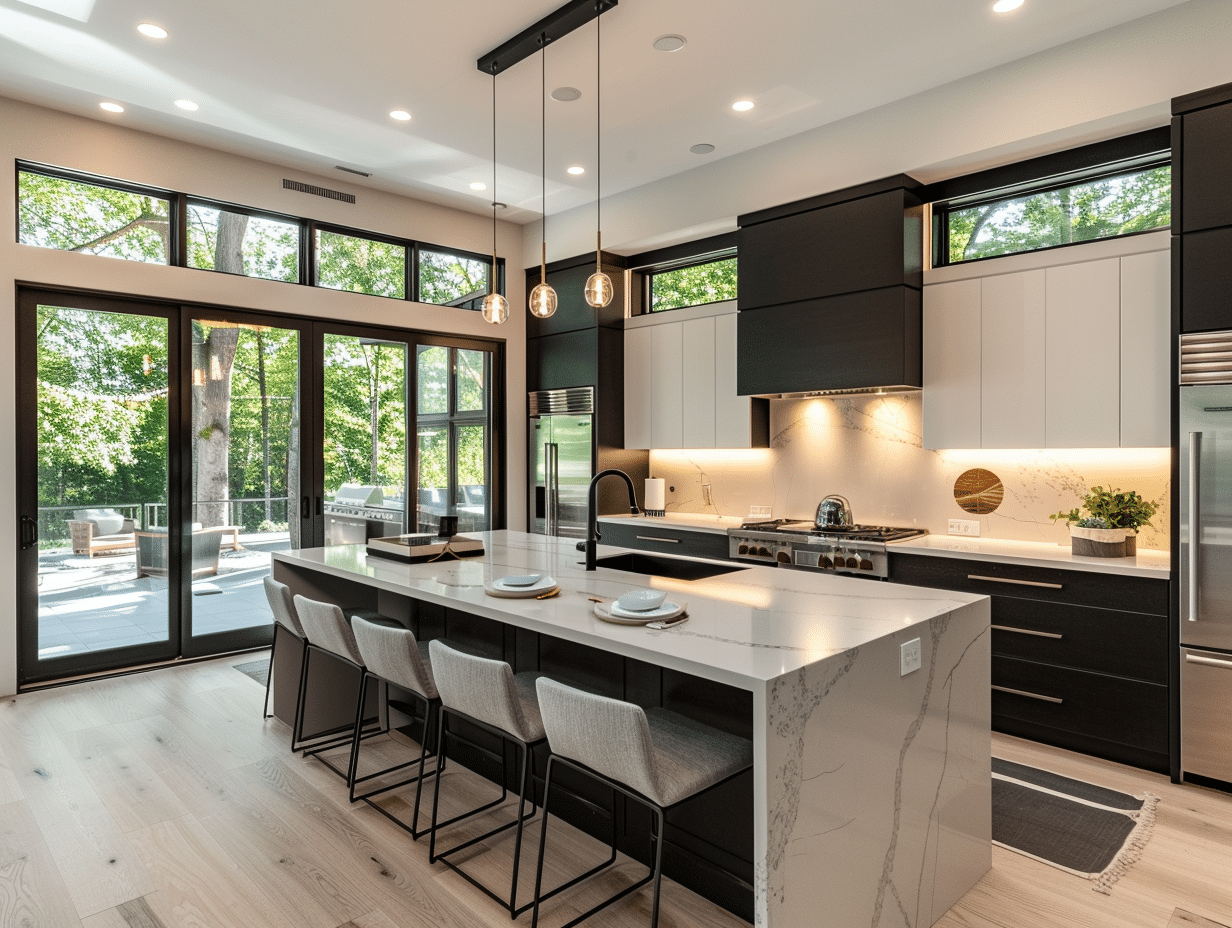 Le choix d’un îlot central peut transformer votre cuisine en un espace convivial et stylé. Optez pour un îlot noir avec un plan de travail en marbre blanc pour un effet contraste saisissant. Les tabourets de bar en métal brossé ou en bois ajoutent une touche industrielle ou naturelle selon vos préférences.